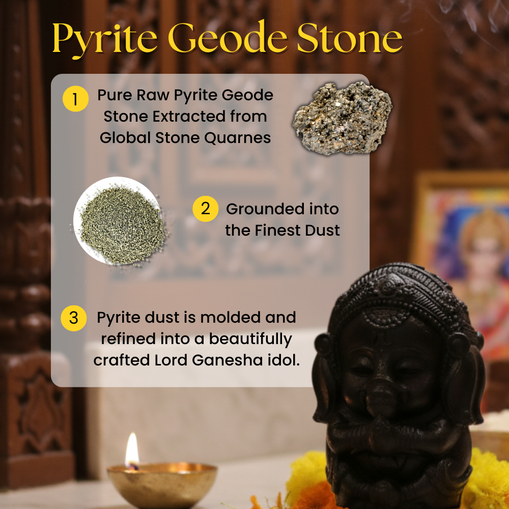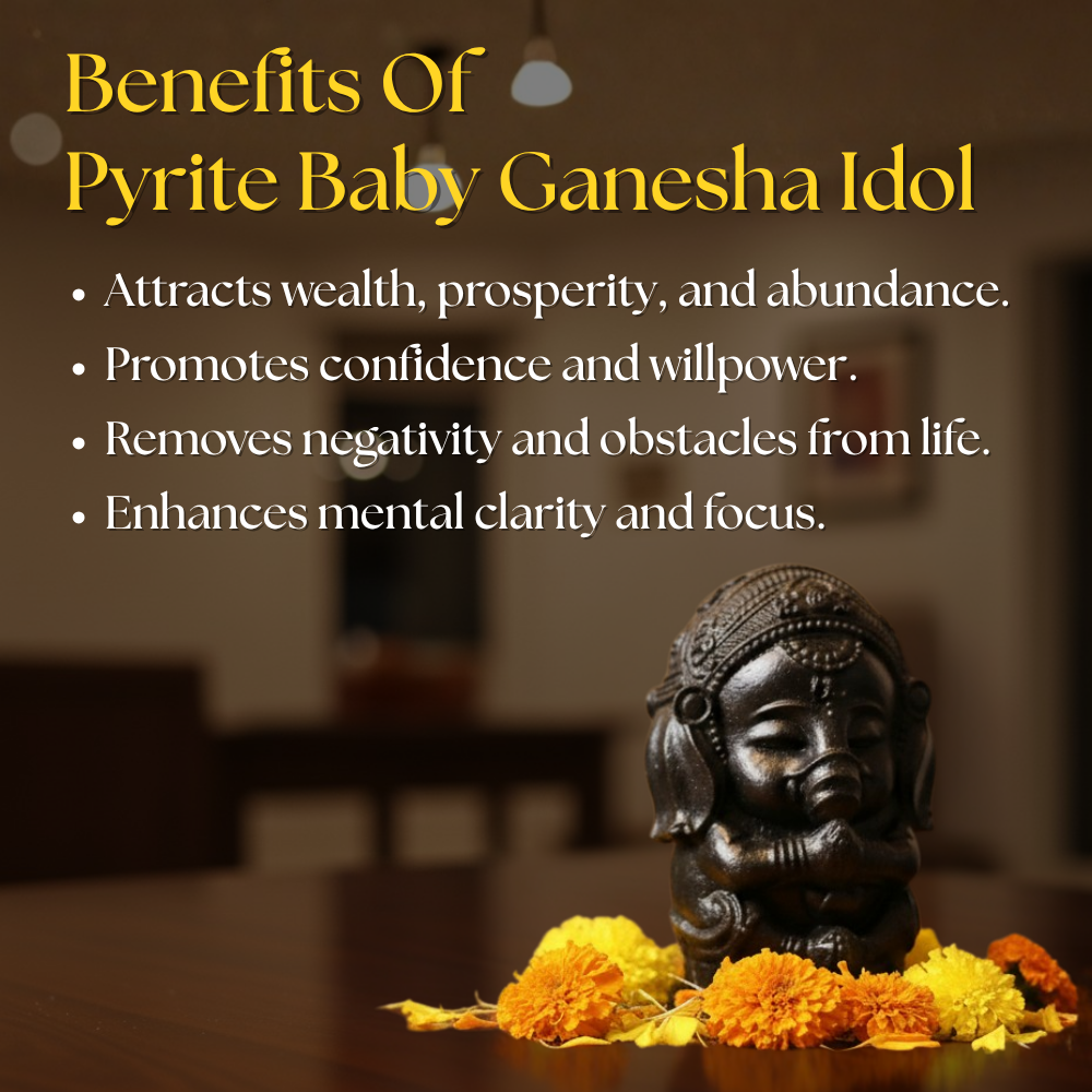 Baby Ganesha Idol represents purity and protection, while Pyrite attracts wealth, luck, and shields from negativity. Place it in your home temple, study desk, or office to remove obstacles and invite success.