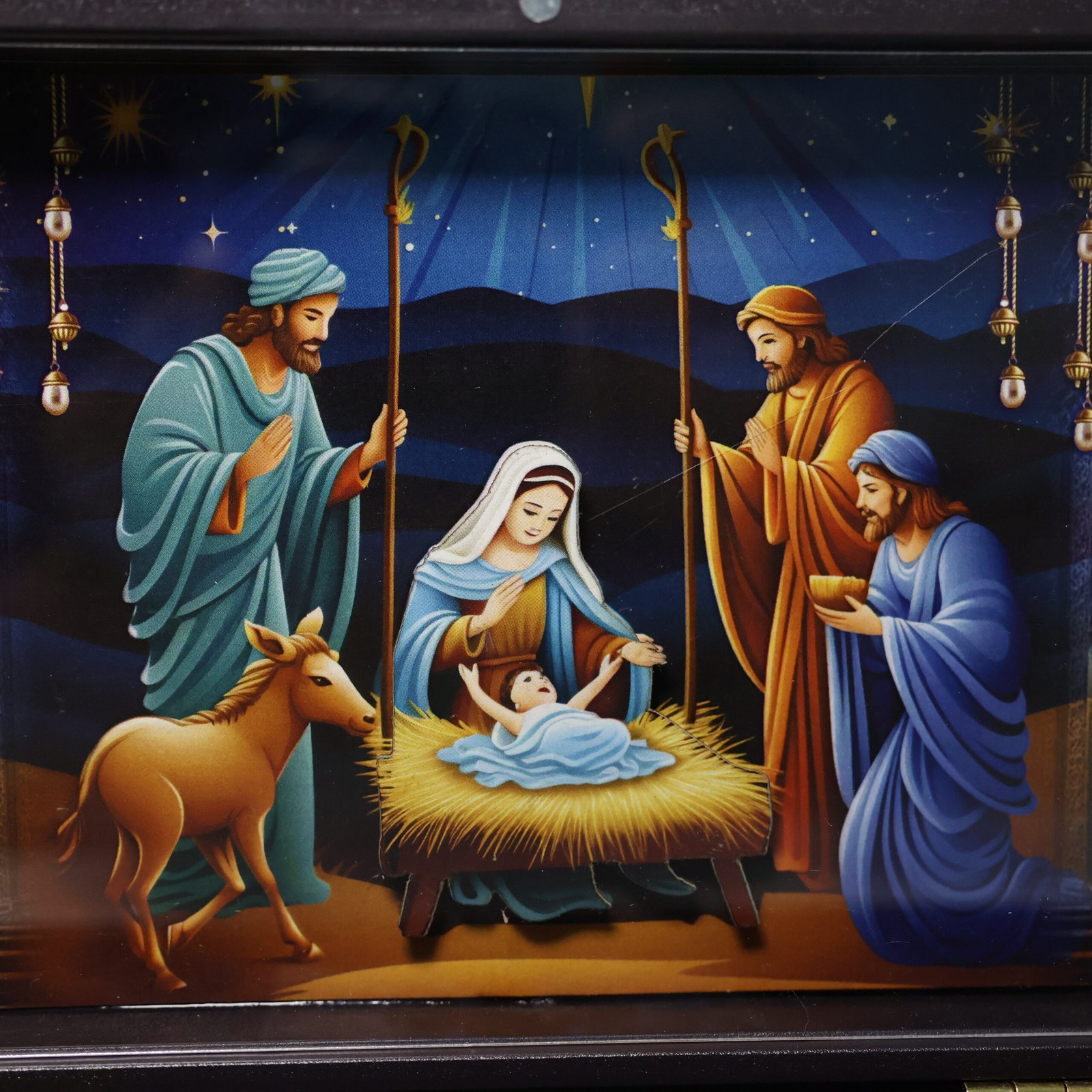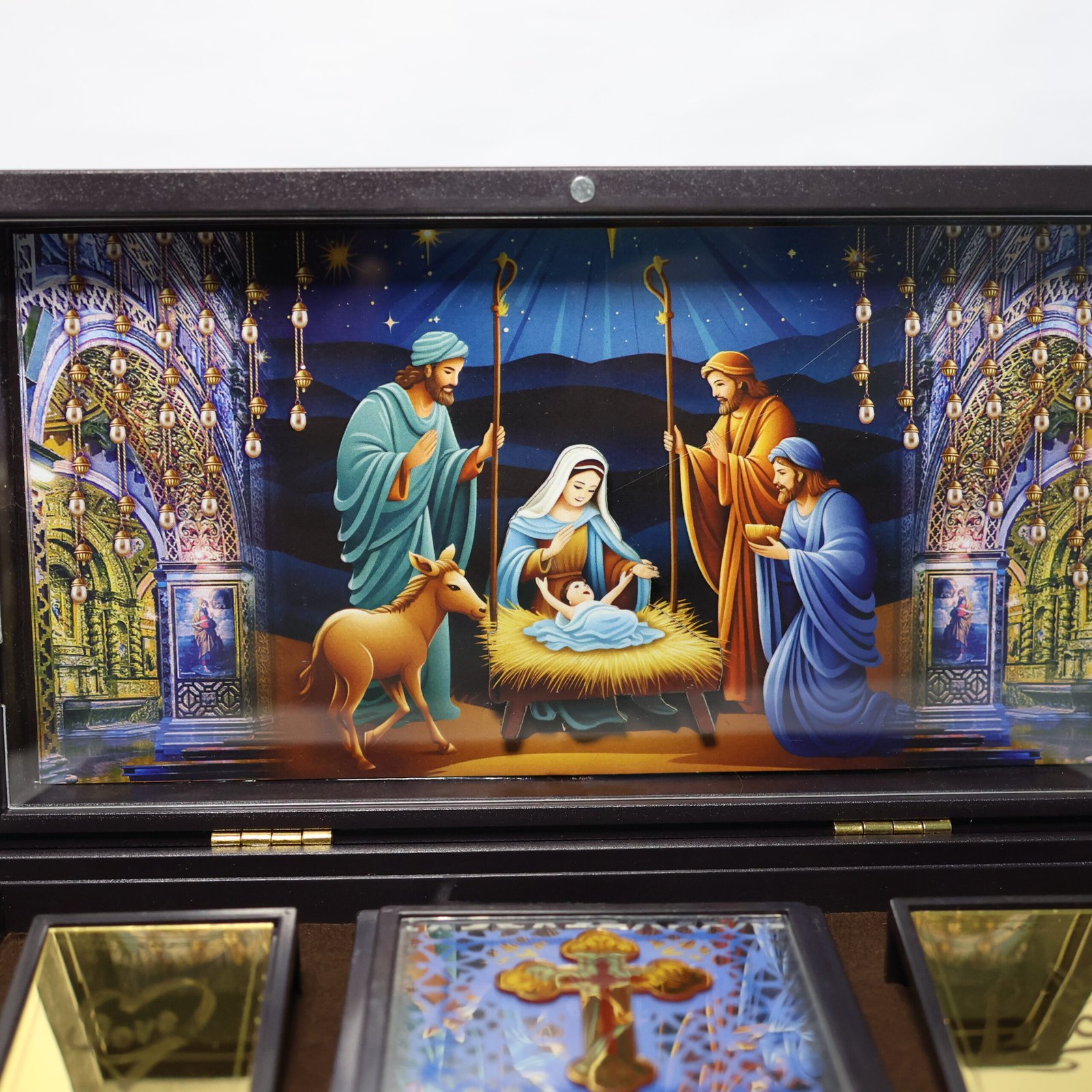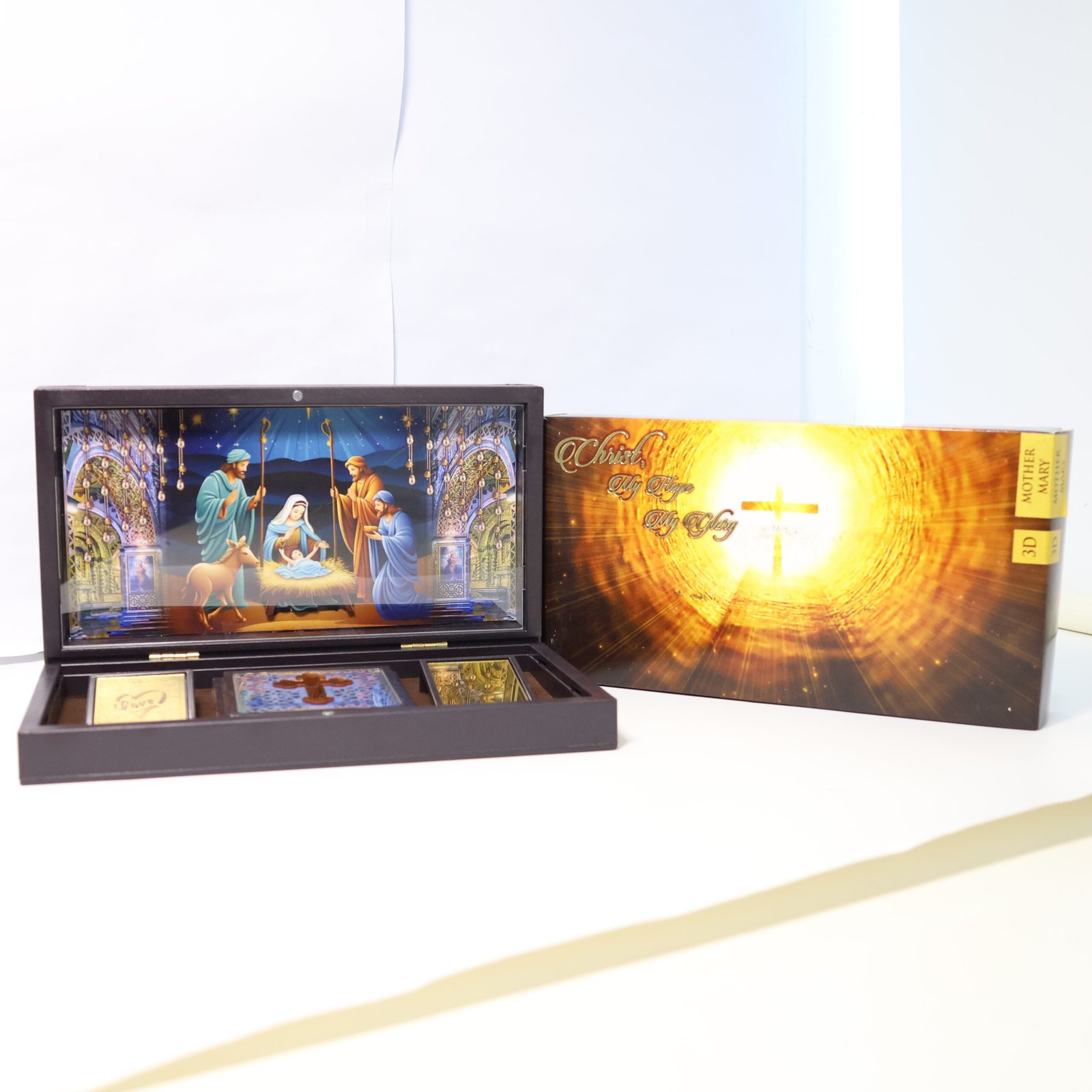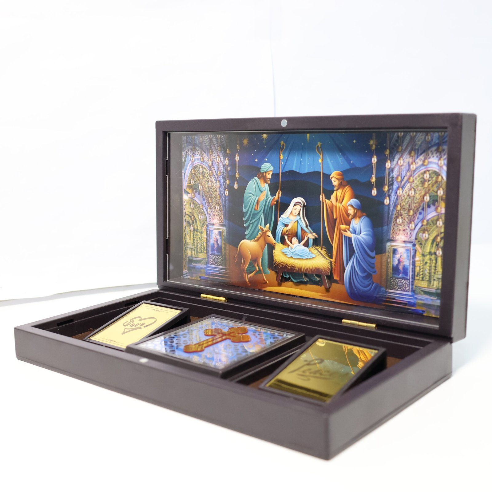 This beautifully crafted Baby Jesus Christ 3D Prayer Box invites heavenly love and tranquility into your home. This golden-plated devotional box has a glowing 3D image of Jesus Christ set against a gorgeous cathedral-inspired background, signifying faith, forgiveness, and unending grace. It is intricately detailed.