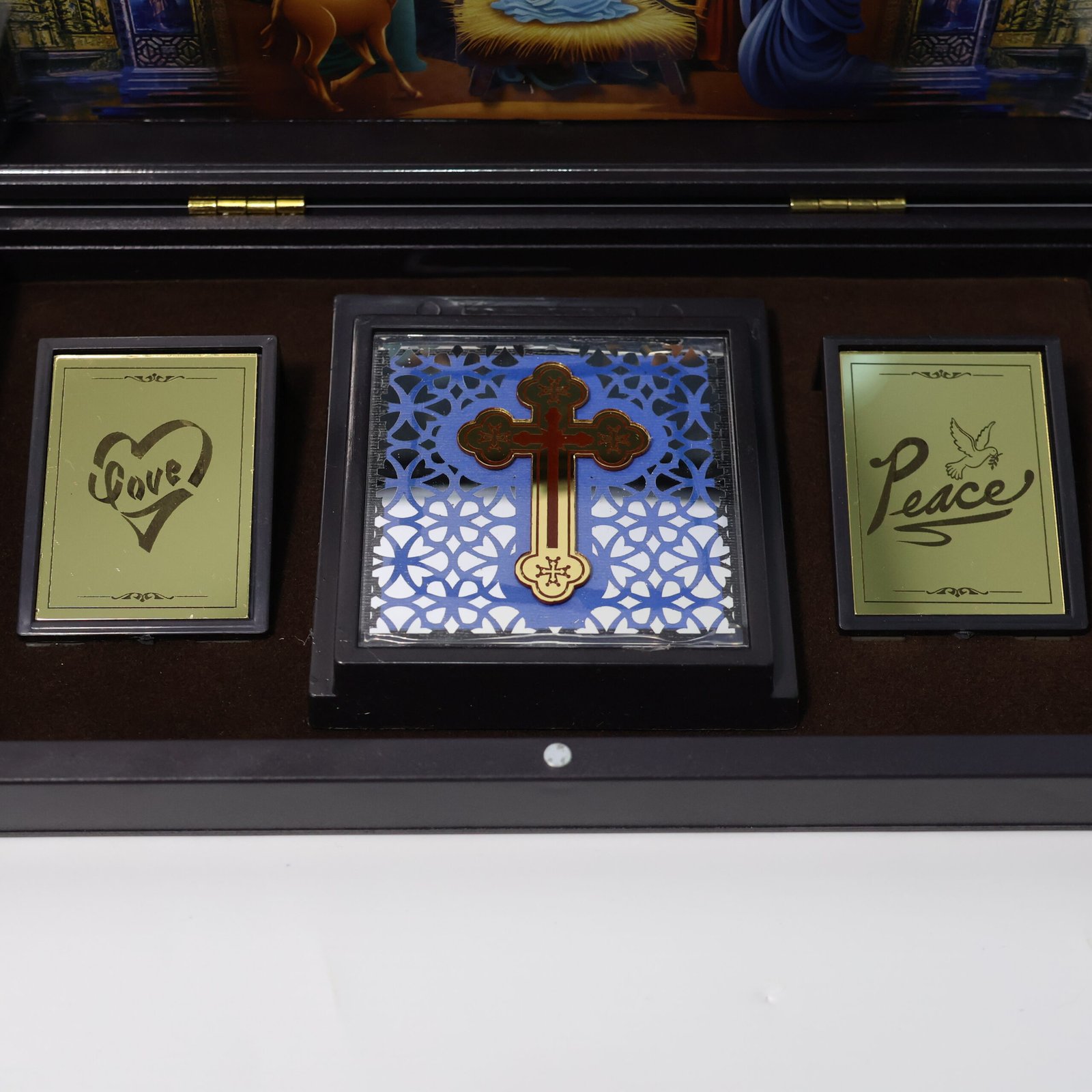A stunningly crafted Holy Cross and two golden plaques bearing the words “Love” and “Peace,” which represent Christ’s timeless message of harmony and compassion, are situated in the center. It is ideal for your altar, prayer room, or home decor because of its warm tones and velvet brown base, which create a sacred atmosphere.