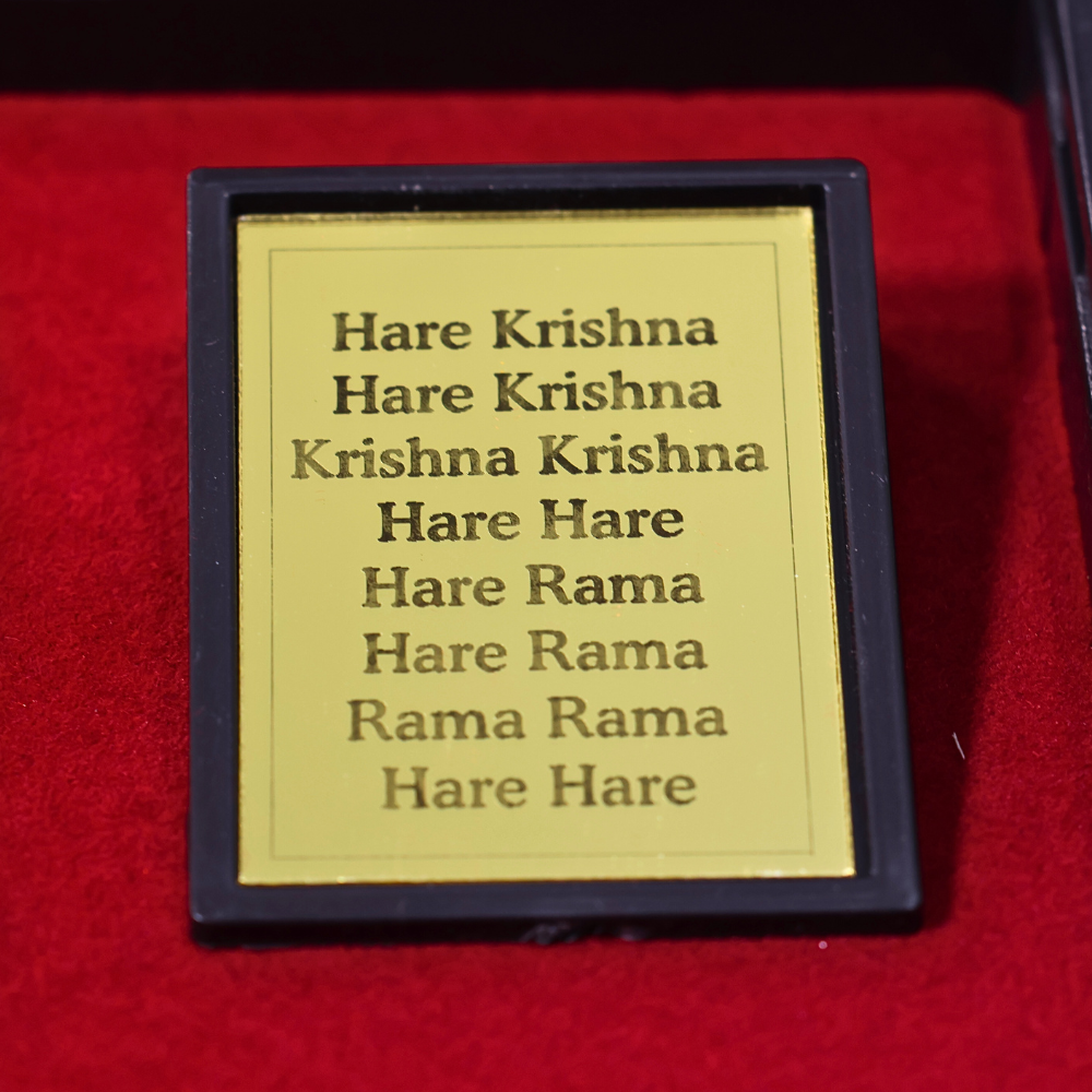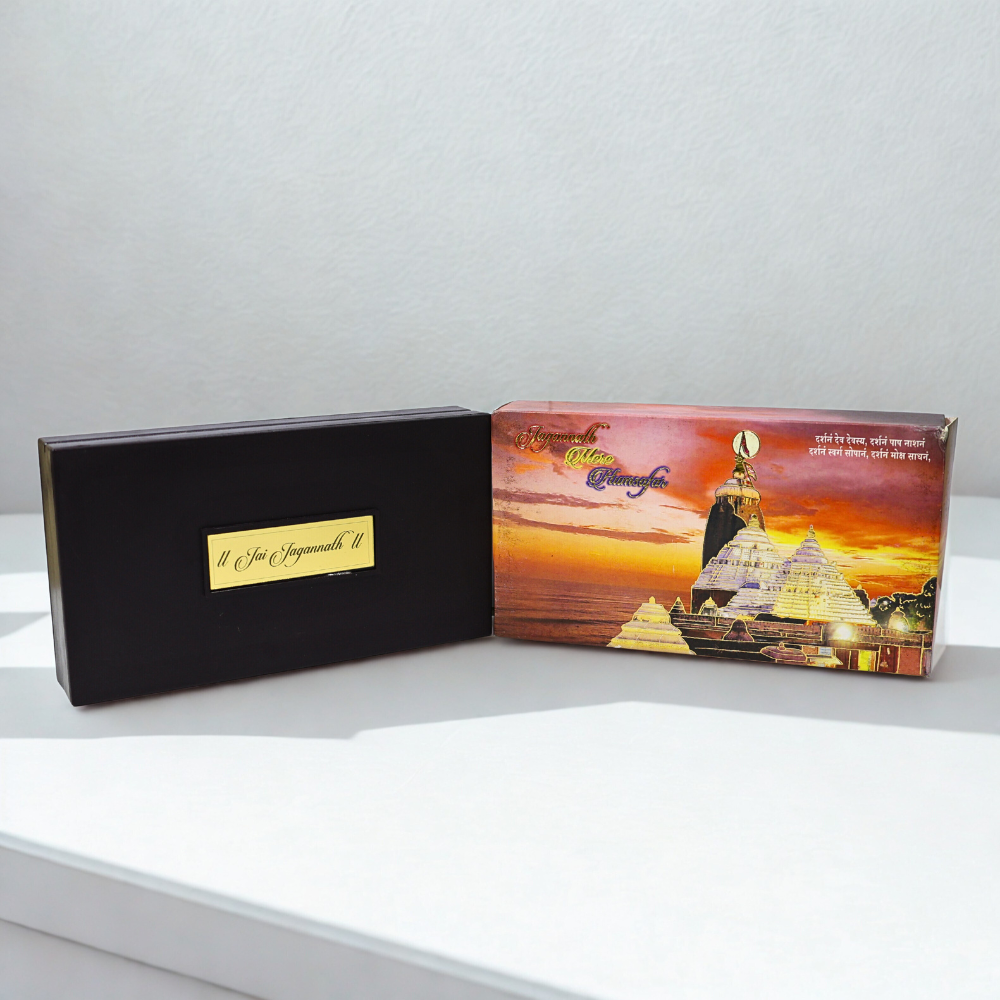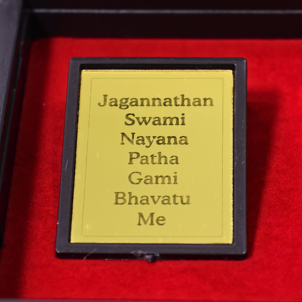 It is an elegant prayer box featuring the holy Charan Paduka of Jagannath Bhagavan in the center and two golden plates of mantras engraved on them. The artwork, colors, and golden finishing of this beautiful product have given life to this holy form of Jagannath Bhagavan.