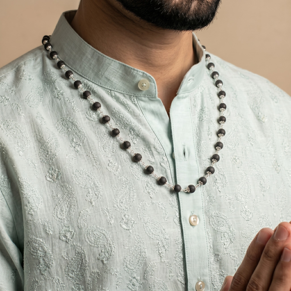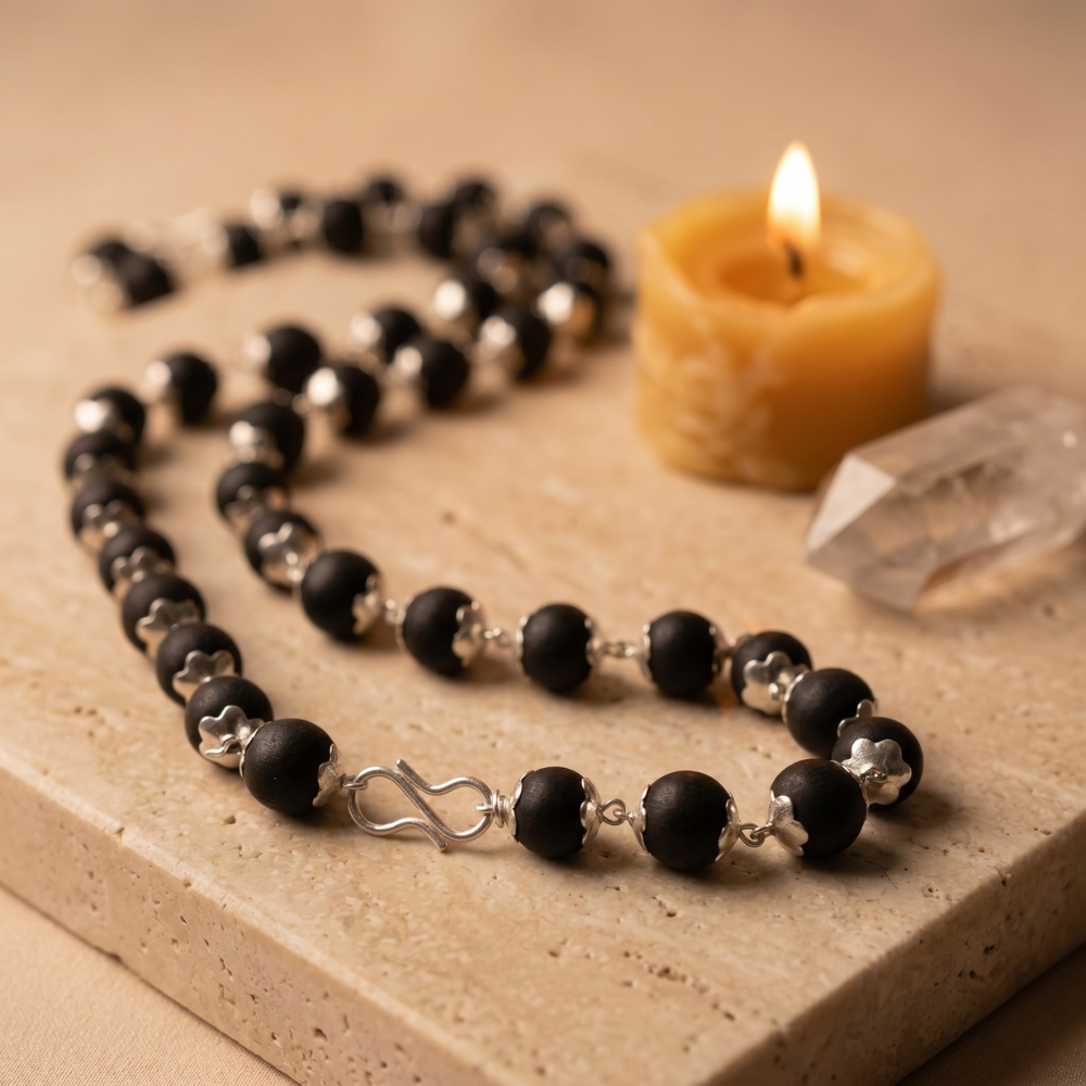 Karungali Mala, also known as the Ebony Wood Mala, is considered to be a sacred accessory with significant importance in the tradition and culture of South India. Made from natural ebony wood beads, the accessory is revered for its energy that protects against negative vibrations and promotes peace, concentration, and spiritual growth.