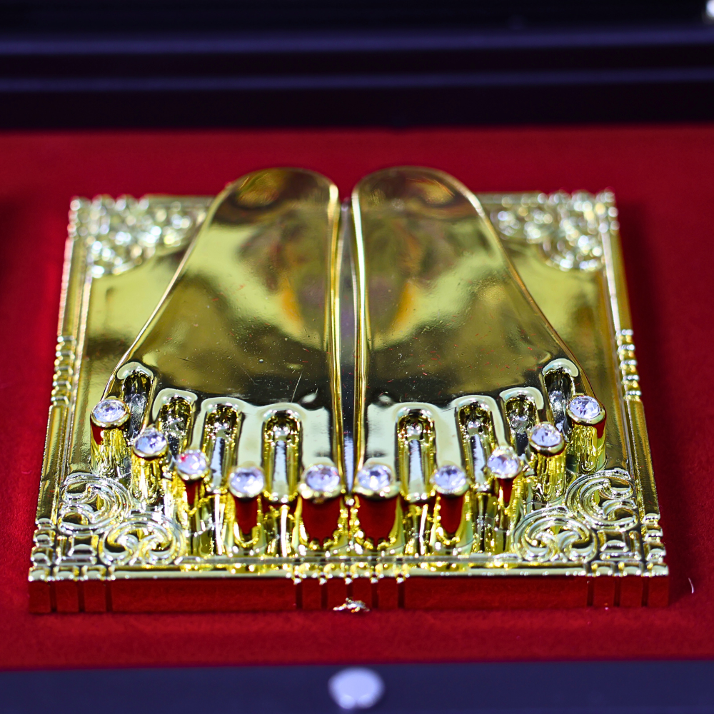 The holy Charan Paduka symbolizing devotion/surrender is placed in the center, while the mantra or quote plates emit euphoric energies that accentuate the multiplication of wealth and the removal of impediments.