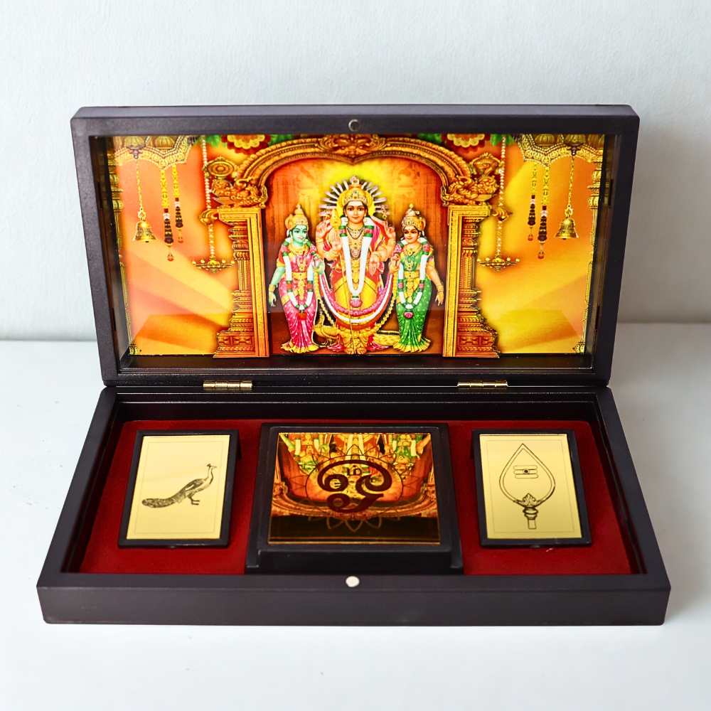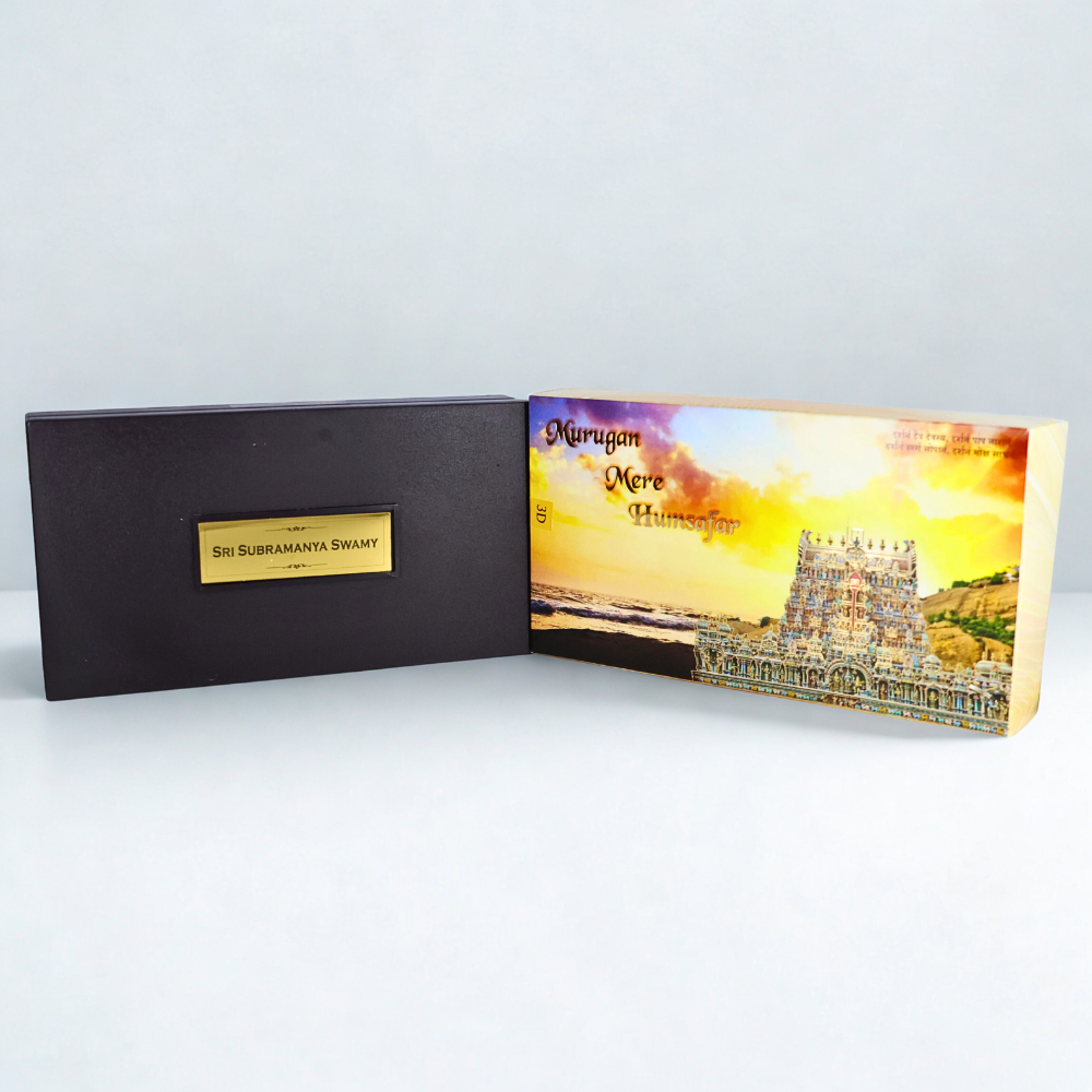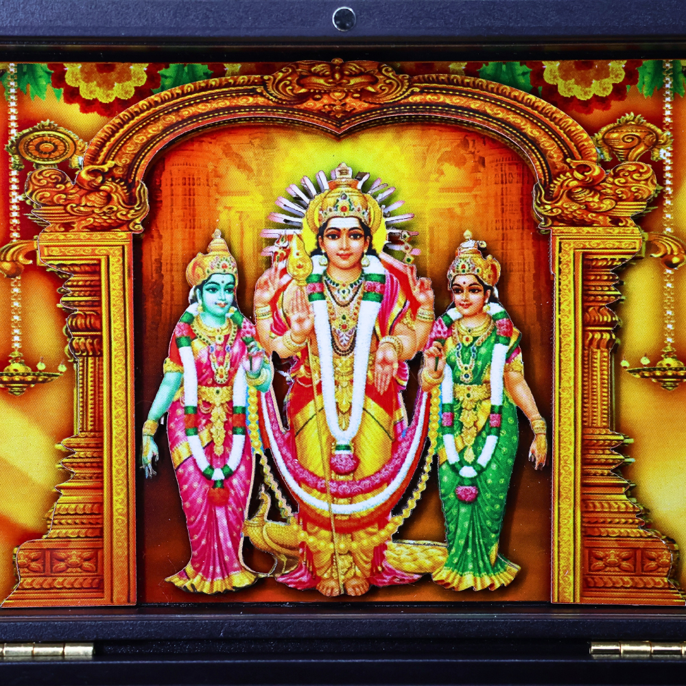 With a vibrant and detailed image of Murugan Swami in a majestic temple arch setting, accompanied by divine symbolism, this prayer box is more than just a piece of decor. It is a personal shrine of faith and focus.