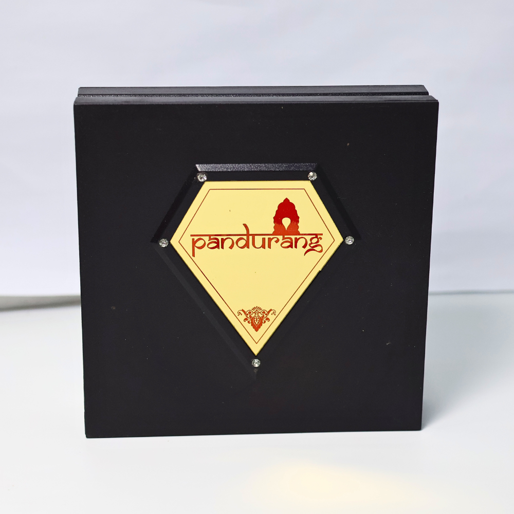 This elegant Shri Vitthal-Rukmini All Black Image Prayer Box is a stunning representation of Lord Vitthal and Rukmini. Handcrafted with intricate detail, this frame features Vithoba, and Rakhumai on his left side. The golden plating finish adds a touch of elegance and sophistication, making it the perfect addition to any home or office on this Ashadhi Ekadashi.