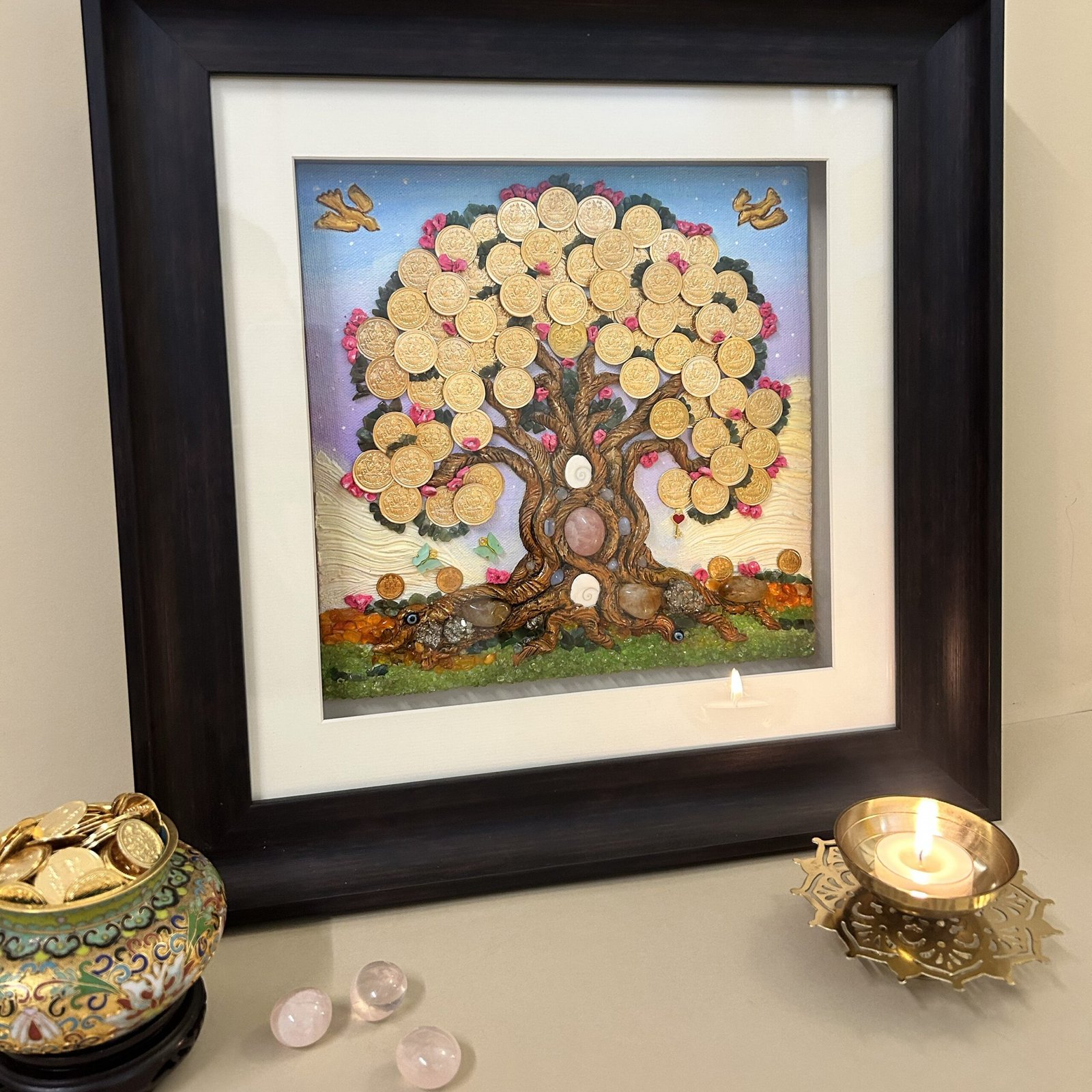 A deeply rooted tree with a robust structure symbolizes unwavering strength and limitless growth. It represents life and progress, while the Lakshmi coins, crystal chips, and tumblers signify prosperity in wealth, health,
